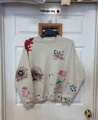 Cult Of Individuality Crazy Scribble Sketch Crew Neck Sweatshirt Vintage Winter Cream